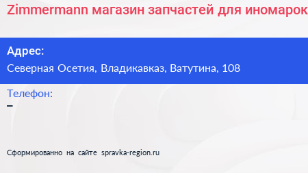 Zimmermann, магазин запчастей для иномарок по адресу Северная Осетия, Владикавказ, Ватутина, 108 в дальнейшем Организация, размещена в следующих категориях: