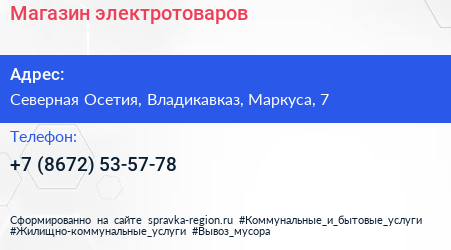 Магазин электротоваров по адресу Северная Осетия, Владикавказ, Маркуса, 7 в дальнейшем Организация, размещена в следующих категориях: