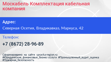 Москабель-Комплектация, кабельная компания по адресу Северная Осетия, Владикавказ, Маркуса, 42 в дальнейшем Организация, размещена в следующих категориях: