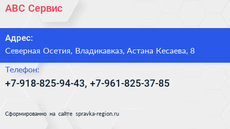 АВС-Сервис по адресу Северная Осетия, Владикавказ, Астана Кесаева, 8 в дальнейшем Организация, размещена в следующих категориях: