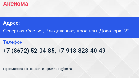 Аксиома по адресу Северная Осетия, Владикавказ, проспект Доватора, 22 в дальнейшем Организация, размещена в следующих категориях: