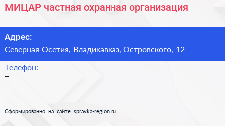 МИЦАР, частная охранная организация по адресу Северная Осетия, Владикавказ, Островского, 12 в дальнейшем Организация, размещена в следующих категориях: