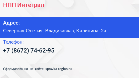 НПП Интеграл по адресу Северная Осетия, Владикавказ, Калинина, 2а в дальнейшем Организация, размещена в следующих категориях:
