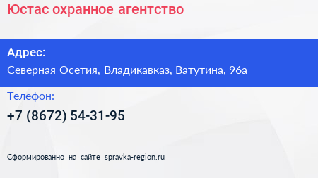 Юстас, охранное агентство по адресу Северная Осетия, Владикавказ, Ватутина, 96а в дальнейшем Организация, размещена в следующих категориях:
