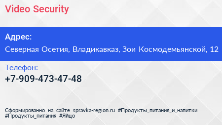Video Security по адресу Северная Осетия, Владикавказ, Зои Космодемьянской, 12 в дальнейшем Организация, размещена в следующих категориях: