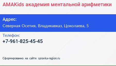 AMAKids, академия ментальной арифметики по адресу Северная Осетия, Владикавказ, Цоколаева, 5 в дальнейшем Организация, размещена в следующих категориях: