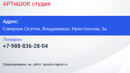 АРТиШОК, студия по адресу Северная Осетия, Владикавказ, Иристонская, 3а в дальнейшем Организация, размещена в следующих категориях: