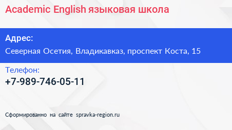 Academic English, языковая школа по адресу Северная Осетия, Владикавказ, проспект Коста, 15 в дальнейшем Организация, размещена в следующих категориях: