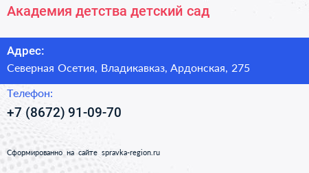 Академия детства, детский сад по адресу Северная Осетия, Владикавказ, Ардонская, 275 в дальнейшем Организация, размещена в следующих категориях: