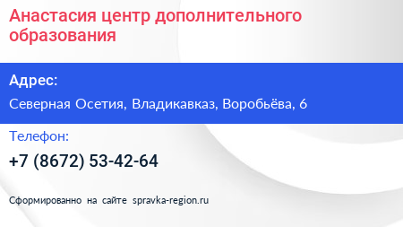 Анастасия, центр дополнительного образования по адресу Северная Осетия, Владикавказ, Воробьёва, 6 в дальнейшем Организация, размещена в следующих категориях: