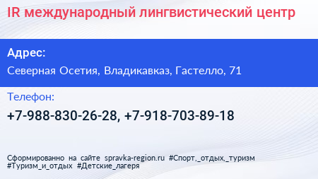 IR, международный лингвистический центр по адресу Северная Осетия, Владикавказ, Гастелло, 71 в дальнейшем Организация, размещена в следующих категориях: