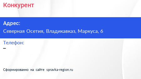 Конкурент по адресу Северная Осетия, Владикавказ, Маркуса, 6 в дальнейшем Организация, размещена в следующих категориях: