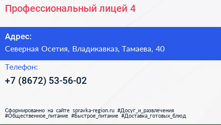 Профессиональный лицей №4 по адресу Северная Осетия, Владикавказ, Тамаева, 40 в дальнейшем Организация, размещена в следующих категориях: