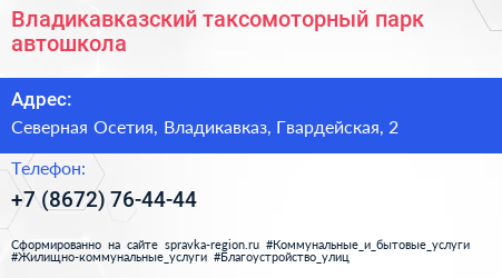 Владикавказский таксомоторный парк, автошкола по адресу Северная Осетия, Владикавказ, Гвардейская, 2 в дальнейшем Организация, размещена в следующих категориях: