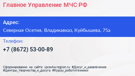 Главное Управление МЧС РФ по адресу Северная Осетия, Владикавказ, Куйбышева, 75а в дальнейшем Организация, размещена в следующих категориях: