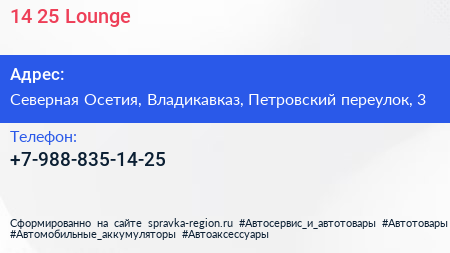 14.25 Lounge по адресу Северная Осетия, Владикавказ, Петровский переулок, 3 в дальнейшем Организация, размещена в следующих категориях: