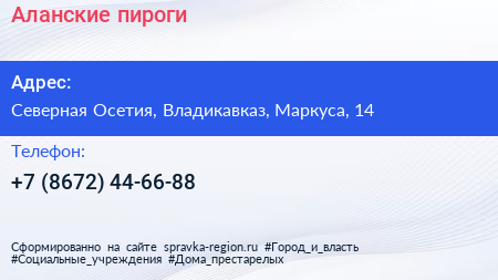 Аланские пироги по адресу Северная Осетия, Владикавказ, Маркуса, 14 в дальнейшем Организация, размещена в следующих категориях: