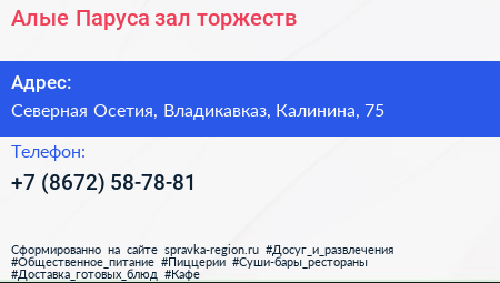 Алые Паруса, зал торжеств по адресу Северная Осетия, Владикавказ, Калинина, 75 в дальнейшем Организация, размещена в следующих категориях:
