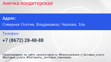 Анечка, кондитерская по адресу Северная Осетия, Владикавказ, Чкалова, 16а в дальнейшем Организация, размещена в следующих категориях: