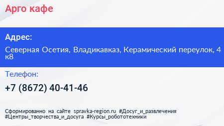 Арго, кафе по адресу Северная Осетия, Владикавказ, Керамический переулок, 4 к8 в дальнейшем Организация, размещена в следующих категориях: