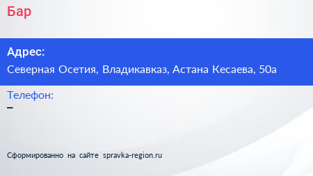 Бар по адресу Северная Осетия, Владикавказ, Астана Кесаева, 50а в дальнейшем Организация, размещена в следующих категориях: