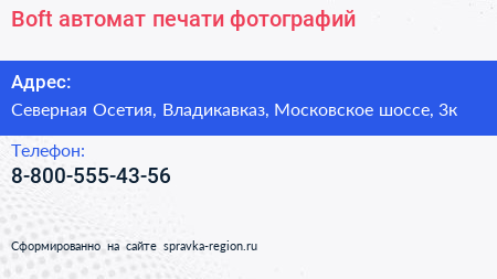 Boft, автомат печати фотографий по адресу Северная Осетия, Владикавказ, Московское шоссе, 3к в дальнейшем Организация, размещена в следующих категориях: