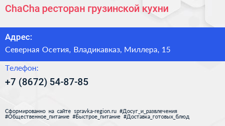 ChaCha, ресторан грузинской кухни по адресу Северная Осетия, Владикавказ, Миллера, 15 в дальнейшем Организация, размещена в следующих категориях: