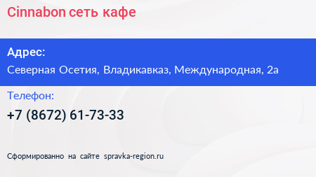 Cinnabon, сеть кафе по адресу Северная Осетия, Владикавказ, Международная, 2а в дальнейшем Организация, размещена в следующих категориях: