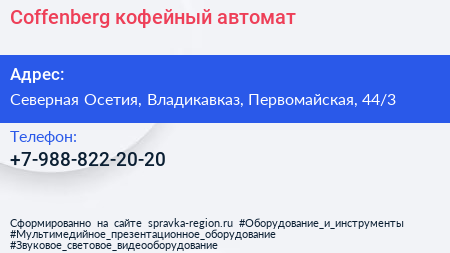 Coffenberg, кофейный автомат по адресу Северная Осетия, Владикавказ, Первомайская, 44/3 в дальнейшем Организация, размещена в следующих категориях: