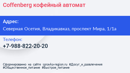 Coffenberg, кофейный автомат по адресу Северная Осетия, Владикавказ, проспект Мира, 1/1а в дальнейшем Организация, размещена в следующих категориях: