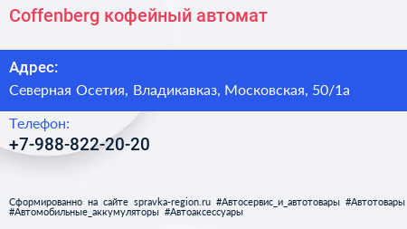 Coffenberg, кофейный автомат по адресу Северная Осетия, Владикавказ, Московская, 50/1а в дальнейшем Организация, размещена в следующих категориях: