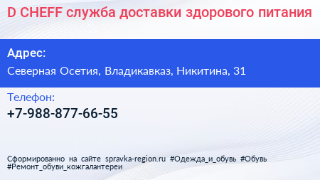 D`CHEFF, служба доставки здорового питания по адресу Северная Осетия, Владикавказ, Никитина, 31 в дальнейшем Организация, размещена в следующих категориях: