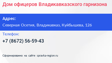 Дом офицеров Владикавказского гарнизона по адресу Северная Осетия, Владикавказ, Куйбышева, 126 в дальнейшем Организация, размещена в следующих категориях: