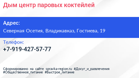 Дым, центр паровых коктейлей по адресу Северная Осетия, Владикавказ, Гостиева, 19 в дальнейшем Организация, размещена в следующих категориях: