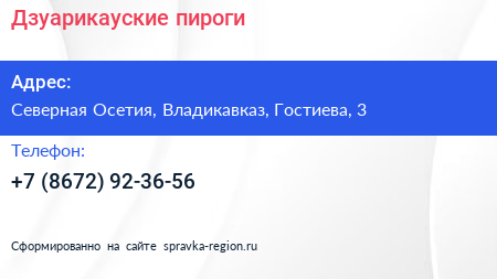 Дзуарикауские пироги по адресу Северная Осетия, Владикавказ, Гостиева, 3 в дальнейшем Организация, размещена в следующих категориях: