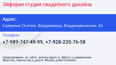 Эйфория, студия свадебного дизайна по адресу Северная Осетия, Владикавказ, Владикавказская, 65 в дальнейшем Организация, размещена в следующих категориях: