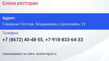 Елена, ресторан по адресу Северная Осетия, Владикавказ, Цоколаева, 11 в дальнейшем Организация, размещена в следующих категориях: