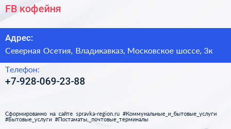 FB, кофейня по адресу Северная Осетия, Владикавказ, Московское шоссе, 3к в дальнейшем Организация, размещена в следующих категориях: