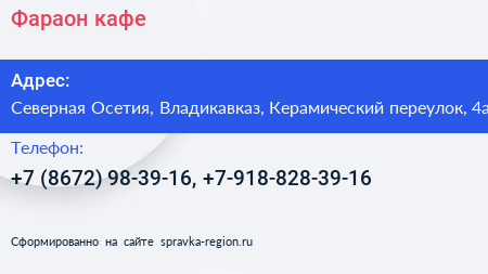 Фараон, кафе по адресу Северная Осетия, Владикавказ, Керамический переулок, 4а в дальнейшем Организация, размещена в следующих категориях: