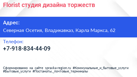 Florist, студия дизайна торжеств по адресу Северная Осетия, Владикавказ, Карла Маркса, 62 в дальнейшем Организация, размещена в следующих категориях: