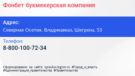 Фонбет, букмекерская компания по адресу Северная Осетия, Владикавказ, Шегрена, 53 в дальнейшем Организация, размещена в следующих категориях: