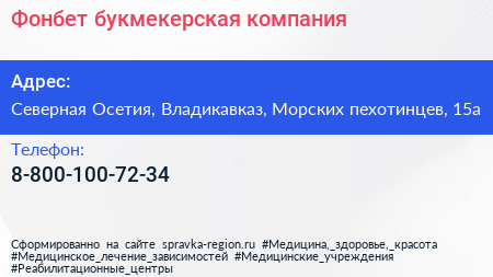 Фонбет, букмекерская компания по адресу Северная Осетия, Владикавказ, Морских пехотинцев, 15а в дальнейшем Организация, размещена в следующих категориях: