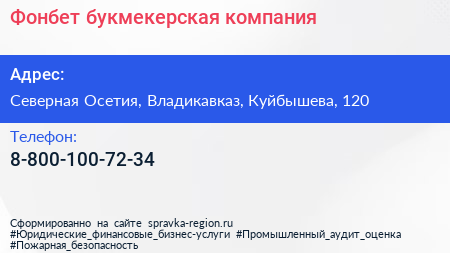 Фонбет, букмекерская компания по адресу Северная Осетия, Владикавказ, Куйбышева, 120 в дальнейшем Организация, размещена в следующих категориях: