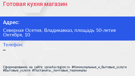 Готовая кухня, магазин по адресу Северная Осетия, Владикавказ, площадь 50-летия Октября, 10 в дальнейшем Организация, размещена в следующих категориях: