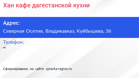 Хан, кафе дагестанской кухни по адресу Северная Осетия, Владикавказ, Куйбышева, 36 в дальнейшем Организация, размещена в следующих категориях: