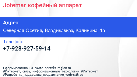 Jofemar, кофейный аппарат по адресу Северная Осетия, Владикавказ, Калинина, 1а в дальнейшем Организация, размещена в следующих категориях: