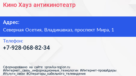Кино Хауз, антикинотеатр по адресу Северная Осетия, Владикавказ, проспект Мира, 1 в дальнейшем Организация, размещена в следующих категориях: