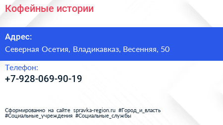 Кофейные истории по адресу Северная Осетия, Владикавказ, Весенняя, 50 в дальнейшем Организация, размещена в следующих категориях: