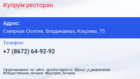 Купрум, ресторан по адресу Северная Осетия, Владикавказ, Коцоева, 75 в дальнейшем Организация, размещена в следующих категориях: