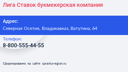 Лига Ставок, букмекерская компания по адресу Северная Осетия, Владикавказ, Ватутина, 64 в дальнейшем Организация, размещена в следующих категориях: